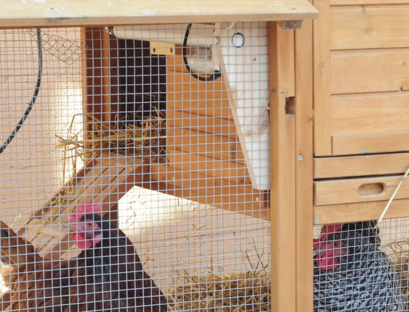 This spring three lovely chicks joined our family, Betty, Penny, and Ginger. Ginger discovered her inner rooster in due time, and was rehomed—we are not zoned for the crowing half of the species. To protect the birds from freezing during our winter travels, and to let them out at the sunrise, they have been housed in the electric henhouse. At dawn and dusk the hens are released or secured by a linear actuator, locking in heat, wind and potential predators locked out.